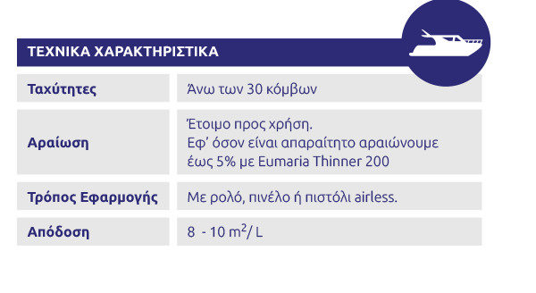 - Ιδανικό για σκάφη με ύφαλα από πολυεστέρα, ξύλο, χάλυβα και αλουμίνιο ή ελαφριά κράματα, με υψηλές ταχύτητες άνω των 30 κόμβων